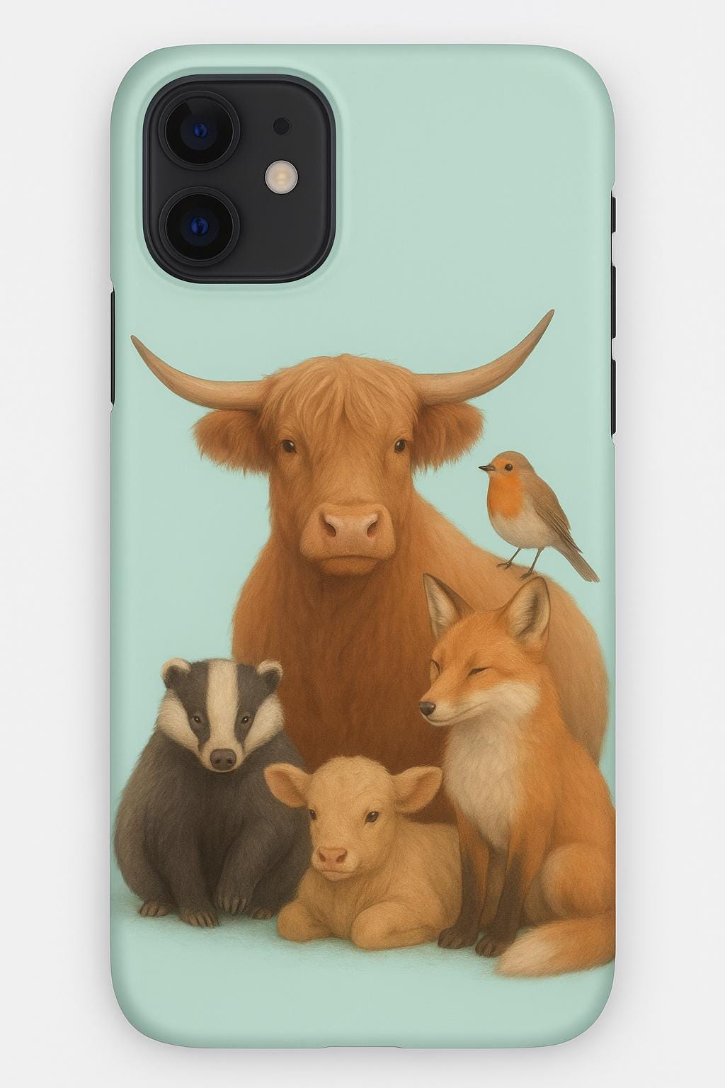 This charming phone case features a beautifully illustrated woodland scene with a gentle Highland cow, a cozy fox, a sweet calf, a curious badger, and a cheerful robin — all set against a soft mint green background. Calm, cozy, and full of character, it’s the perfect blend of nature and modern style.